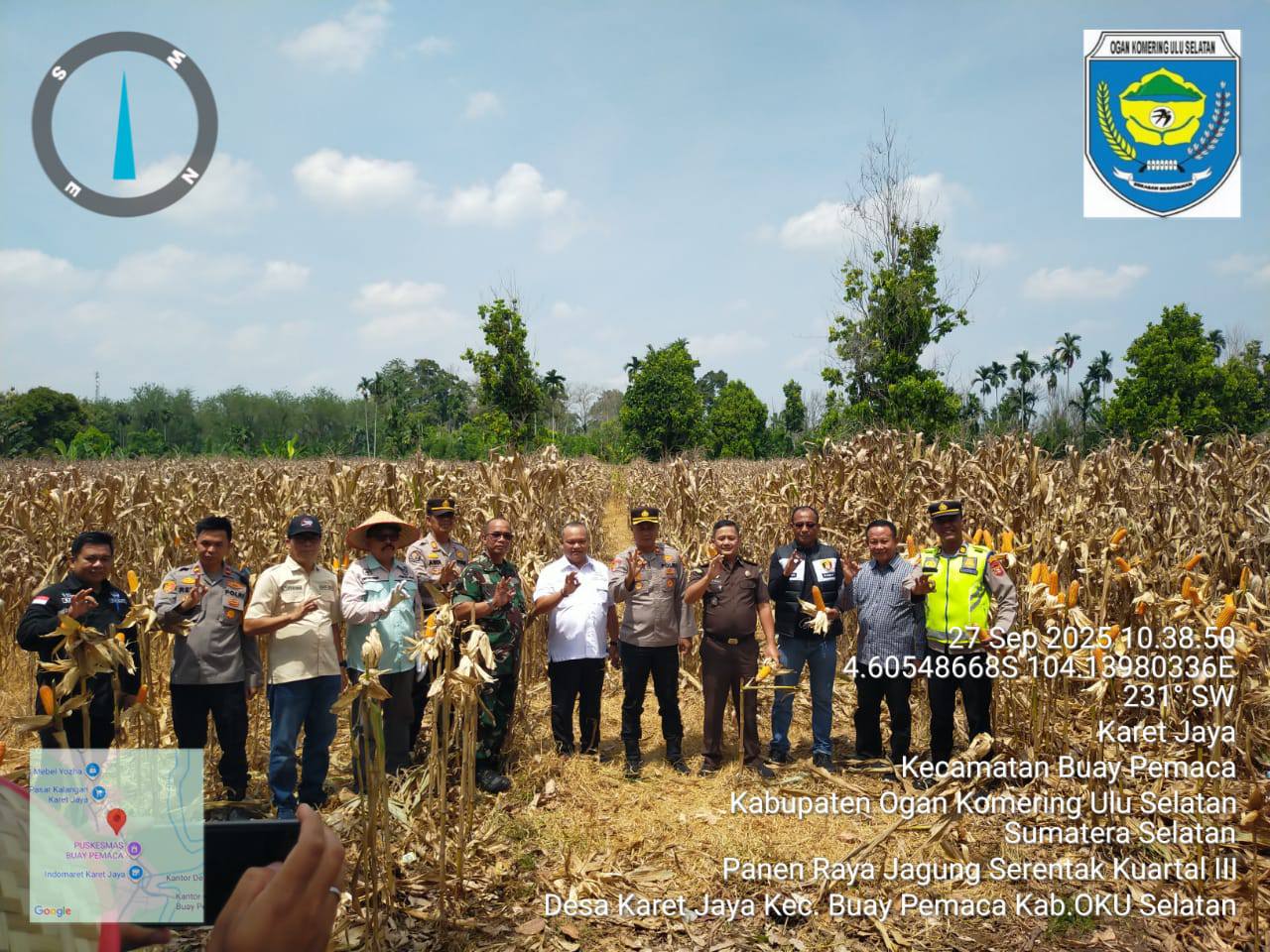 OKU SELATAN, HARIANOKUSELATAN – Pemerintah Kabupaten Ogan Komering Ulu (OKU) Selatan bersama Polres OKU Selatan menggelar Panen Raya Jagung Serentak Kuartal III Tahun 2025 di Desa Karet Jaya, Kecamatan Buay Pemaca, Sabtu (27/9/2025).