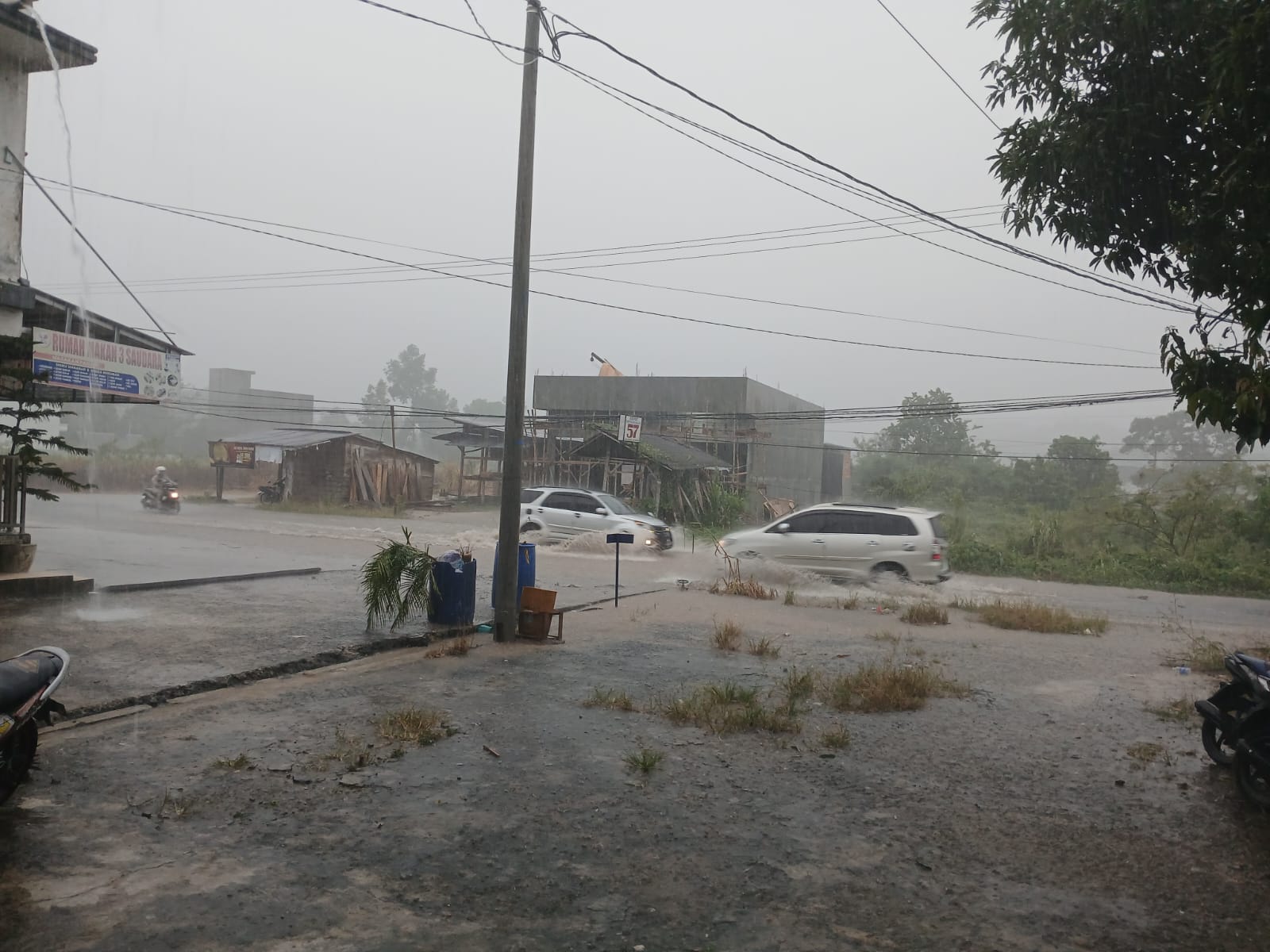 MUARADUA - Hujan deras kembali membuat ruas jalan di kawasan kantor Pemerintah Kabupaten (Pemkab) OKU Selatan tergenang air, Selasa (30/9/2025).